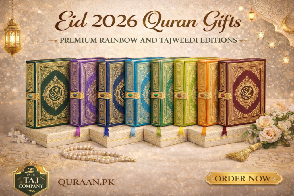 Instead of traditional gifts, many Muslims now prefer giving the Holy Quran because it represents guidance, blessings, and spiritual growth. Premium Quran editions such as Rainbow Tajweedi Qurans and luxury leather Qurans from Taj Company are especially popular choices.