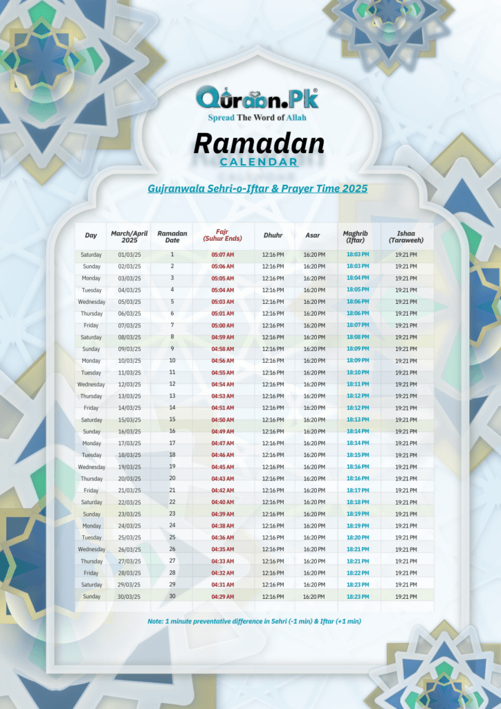 Ramzan Calendar 2025 Sehr o iftar & Prayer’s Timings in Gujranwala
